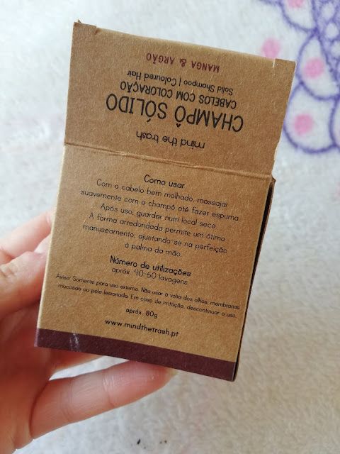 Como tenho pintado o cabelo normalmente uso sempre algo para esse cuidado especifico e para tal escolhi este champô sólido para cabelos coloridos da Mind the Trash. Este champô é de Manga e Argão (confesso uma combinação com um aroma fantástico), faz espuma muito fácil basta uma ligeira passagem nos cabelos molhados e ajuda aos fios ficarem mais soltos (noto isso mal tiro o produto).